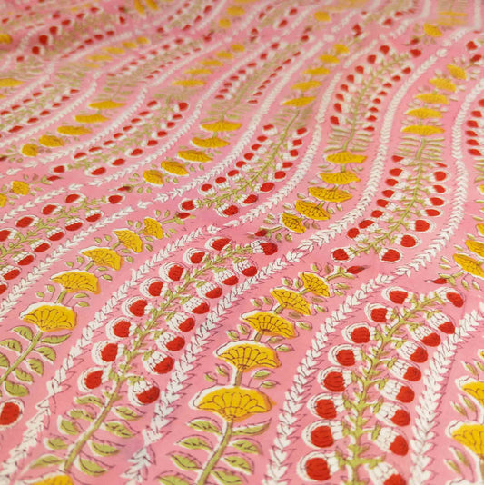 Pink Block Print Fabric - Indian Floral Motif | 100% Cotton | 112cm Wide
