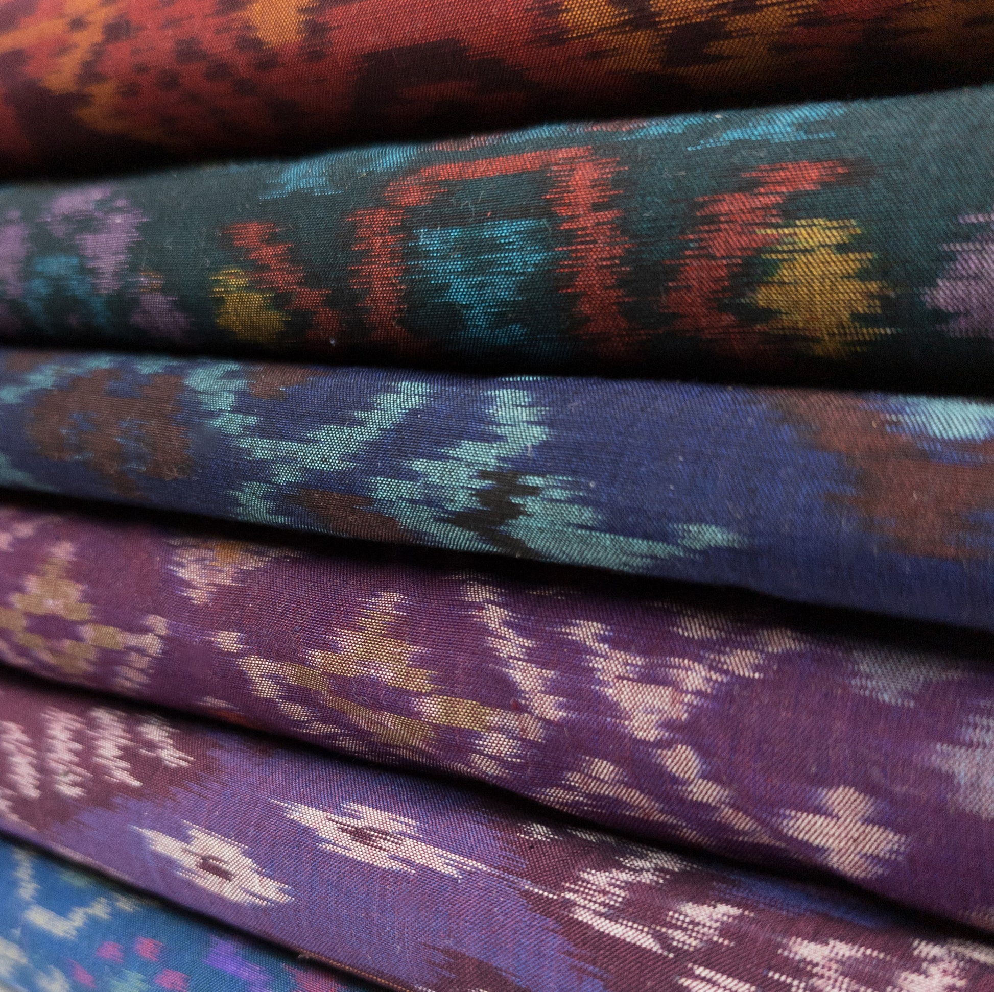 We buy this beautiful cloth from a market in Bali where the weavers sell the cloth they've made on their home looms. The technique of ikat weaving is famous in many parts of the world, and is part of a long textile tradition.