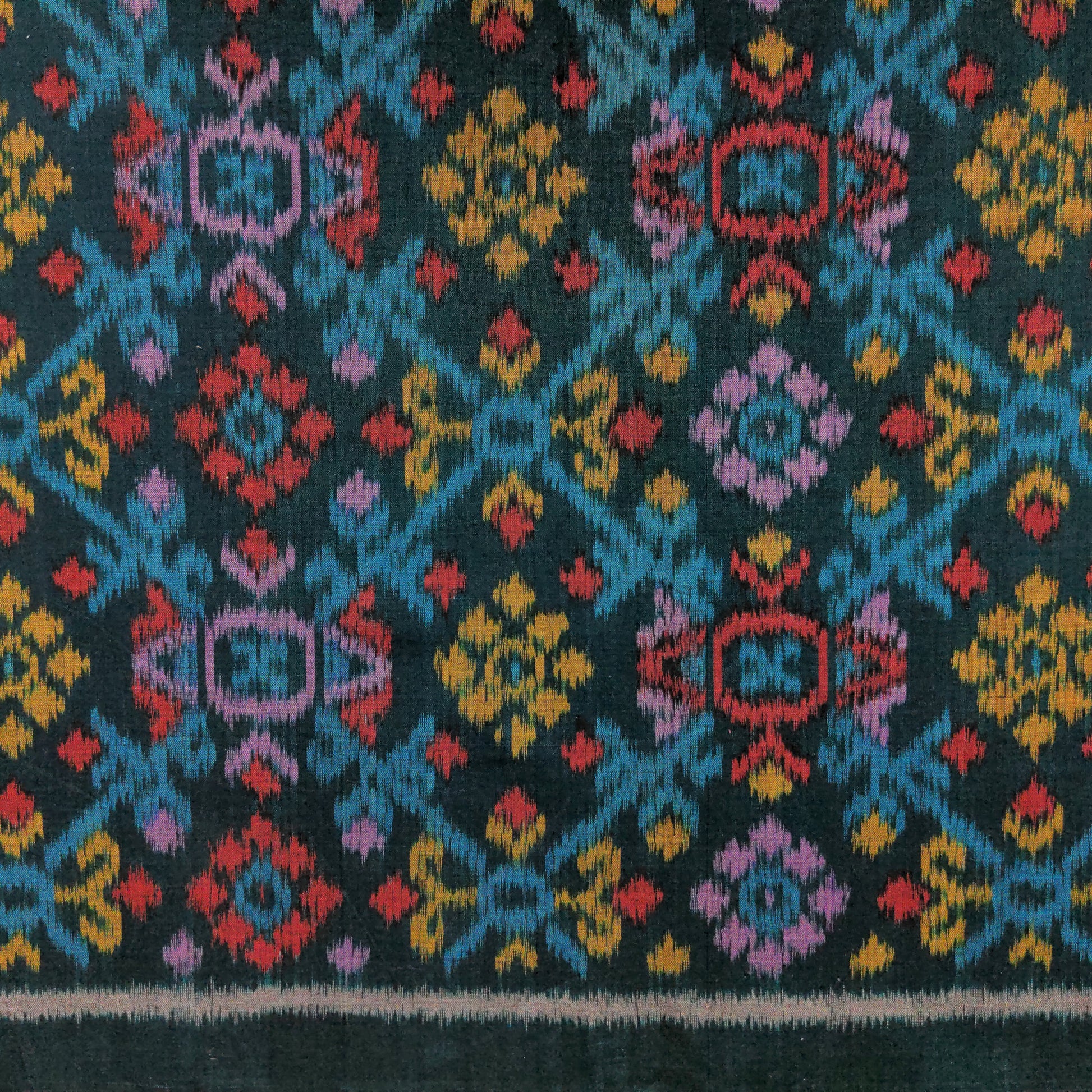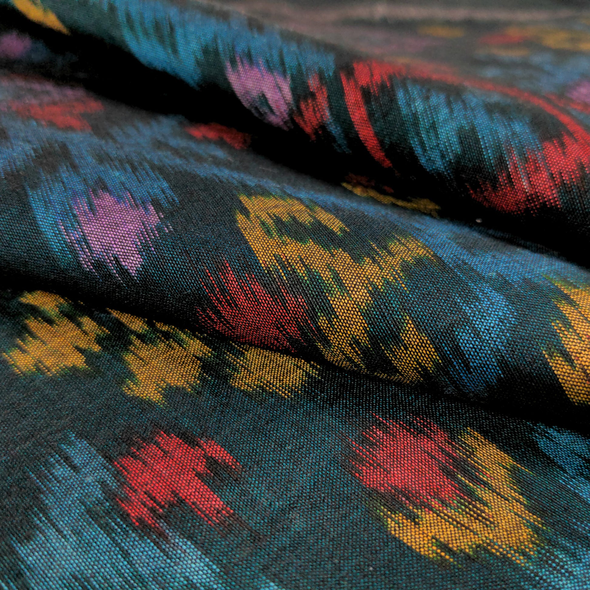 Featuring a racing green background with colourful blue, yellow, purple and red motifs, this fabric showcases the intricate beauty of traditional ikat weaving.