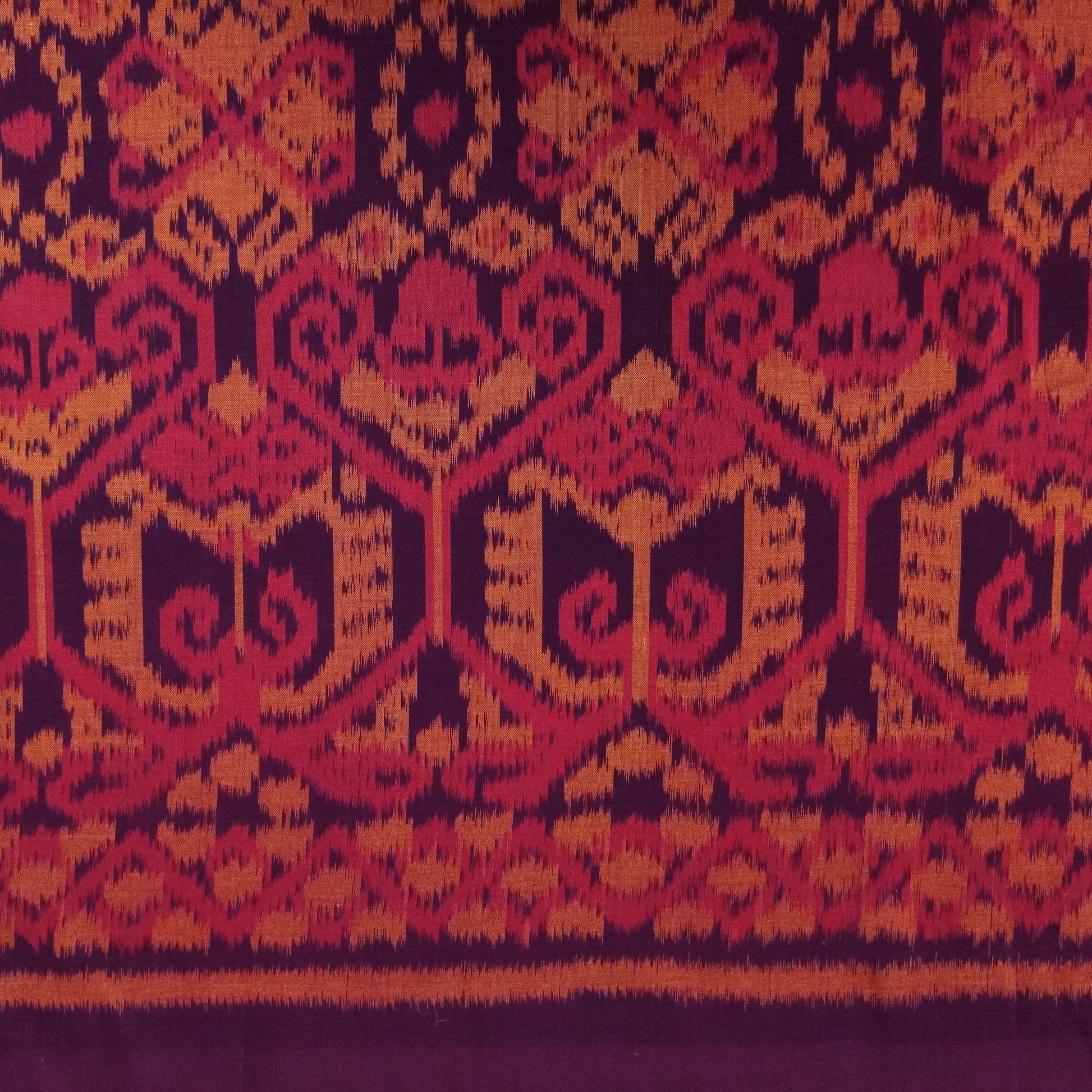 Featuring a rich burgundy background with bold orange and red motifs, this fabric showcases the intricate beauty of traditional ikat weaving.