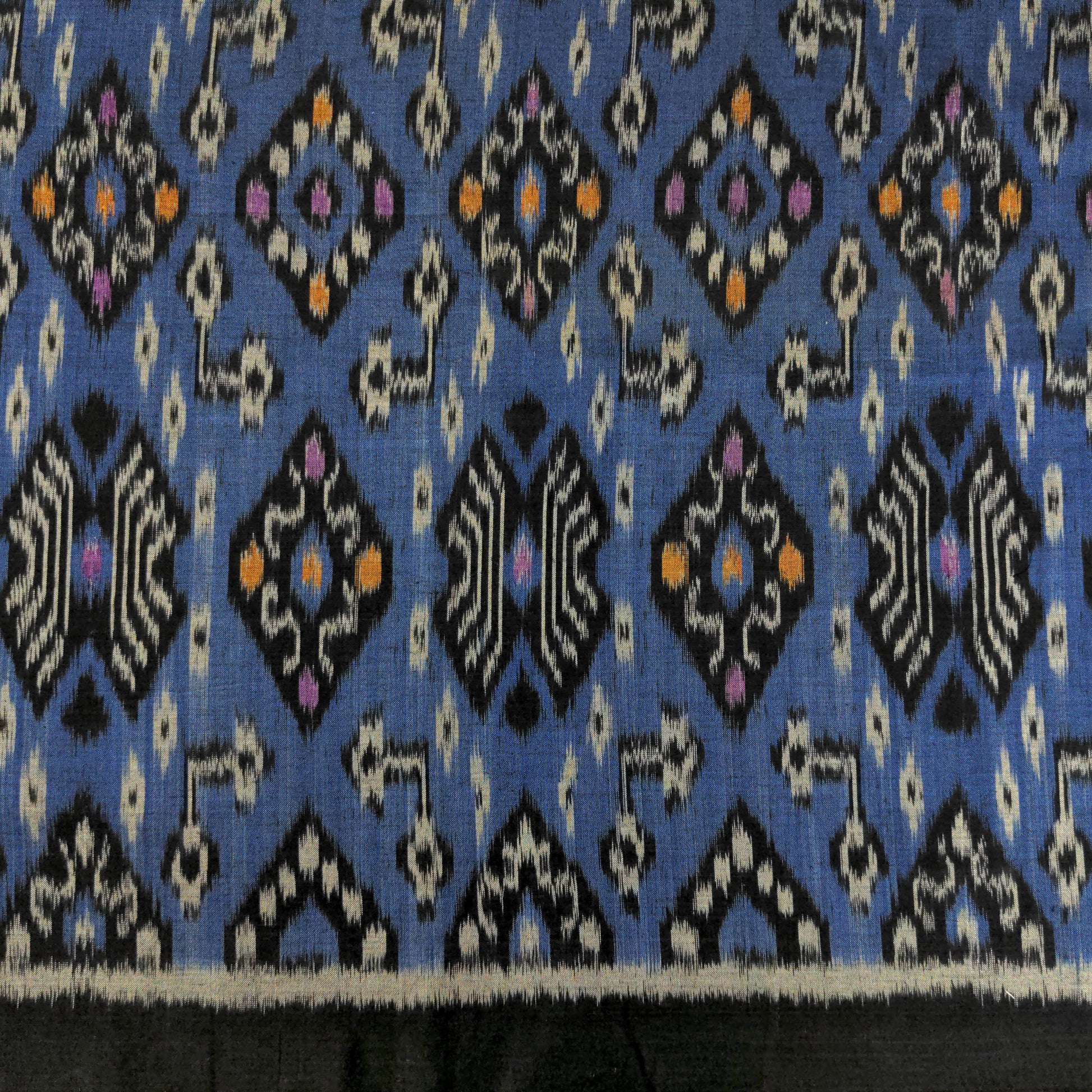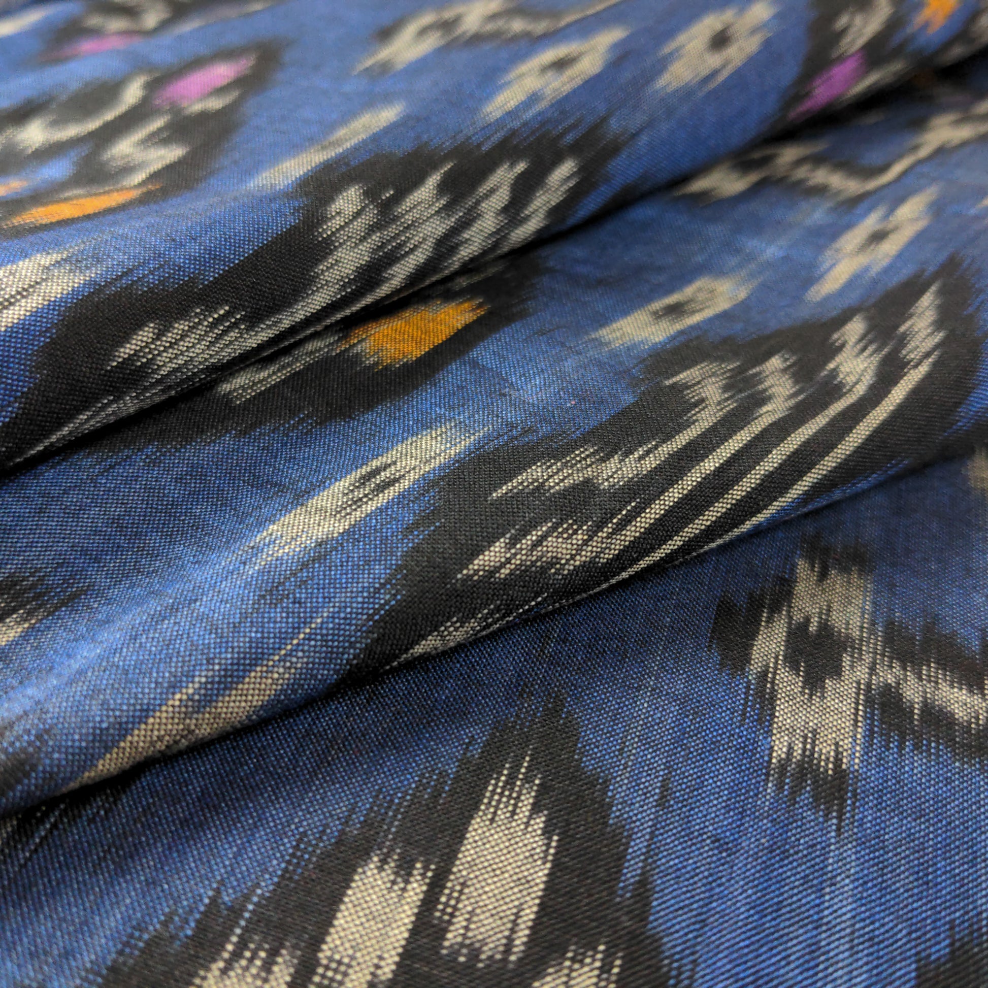 Featuring a rich blue background with black and white motifs, and pops of bright orange, yellow and purple, this fabric showcases the intricate beauty of traditional ikat weaving.